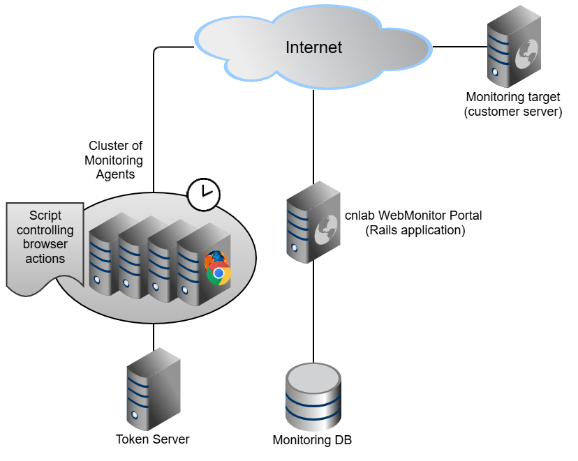 The following figure sketches the structure of our system. All measurements are performed in our highly available cluster. The results are stored in the database and can be evaluated through a web application.